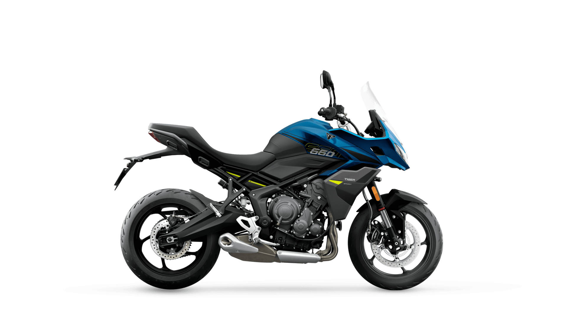 The Tiger Sport 660's chassis is designed to deliver a blend of agility and confidence-inspiring handling. Premium Showa 41 mm USD forks and a Showa monoshock RSU with remote preload adjustment and 150 mm of travel offer easy adjustability when riding fully loaded or with a pillion. Lightweight cast aluminium wheels enhance cornering agility during spirited riding on the open road.